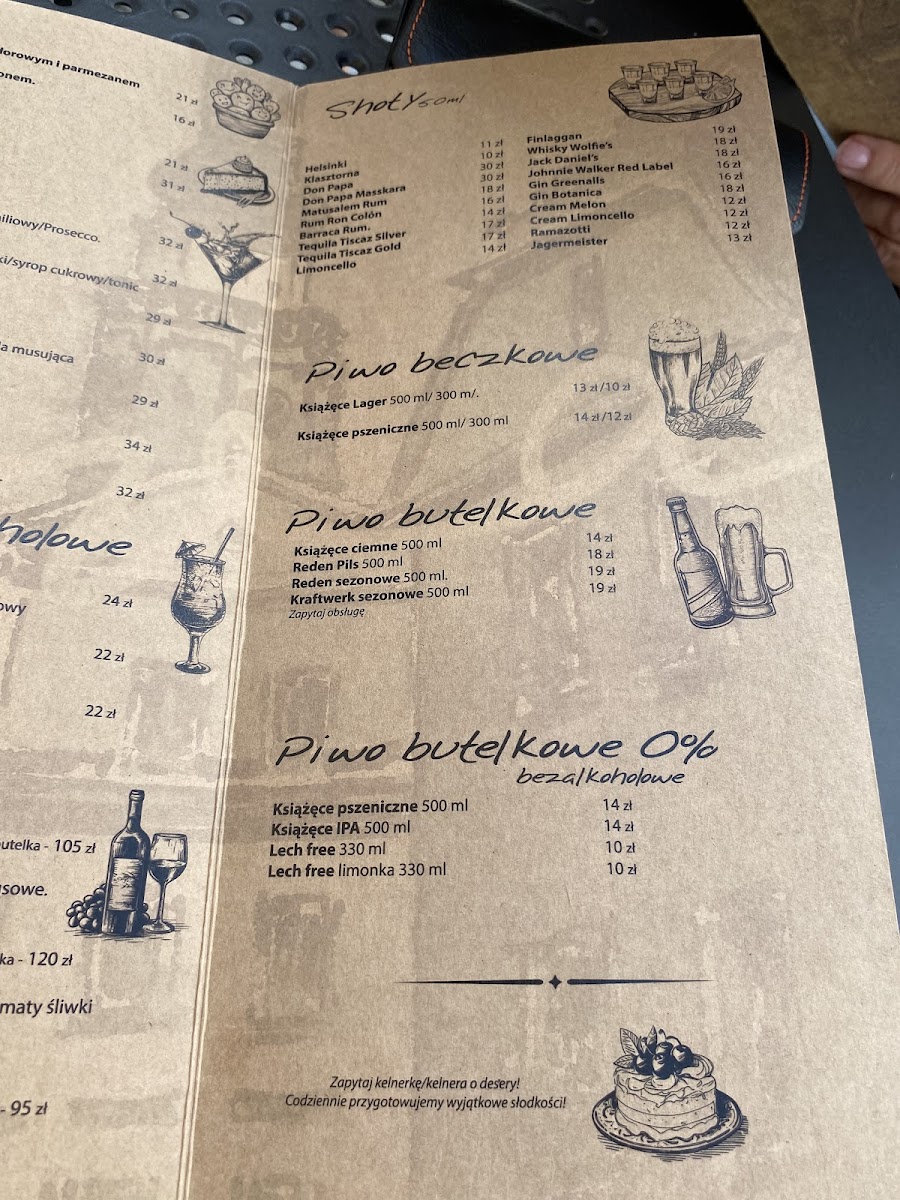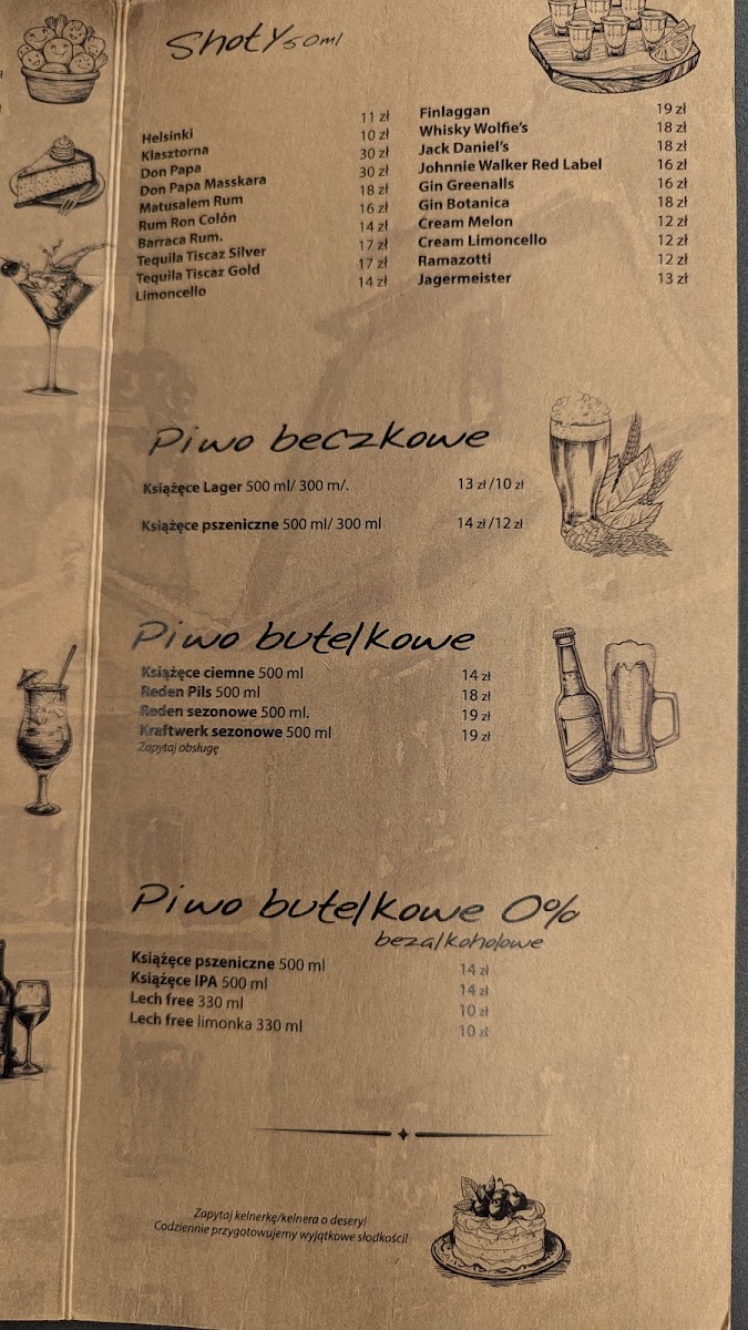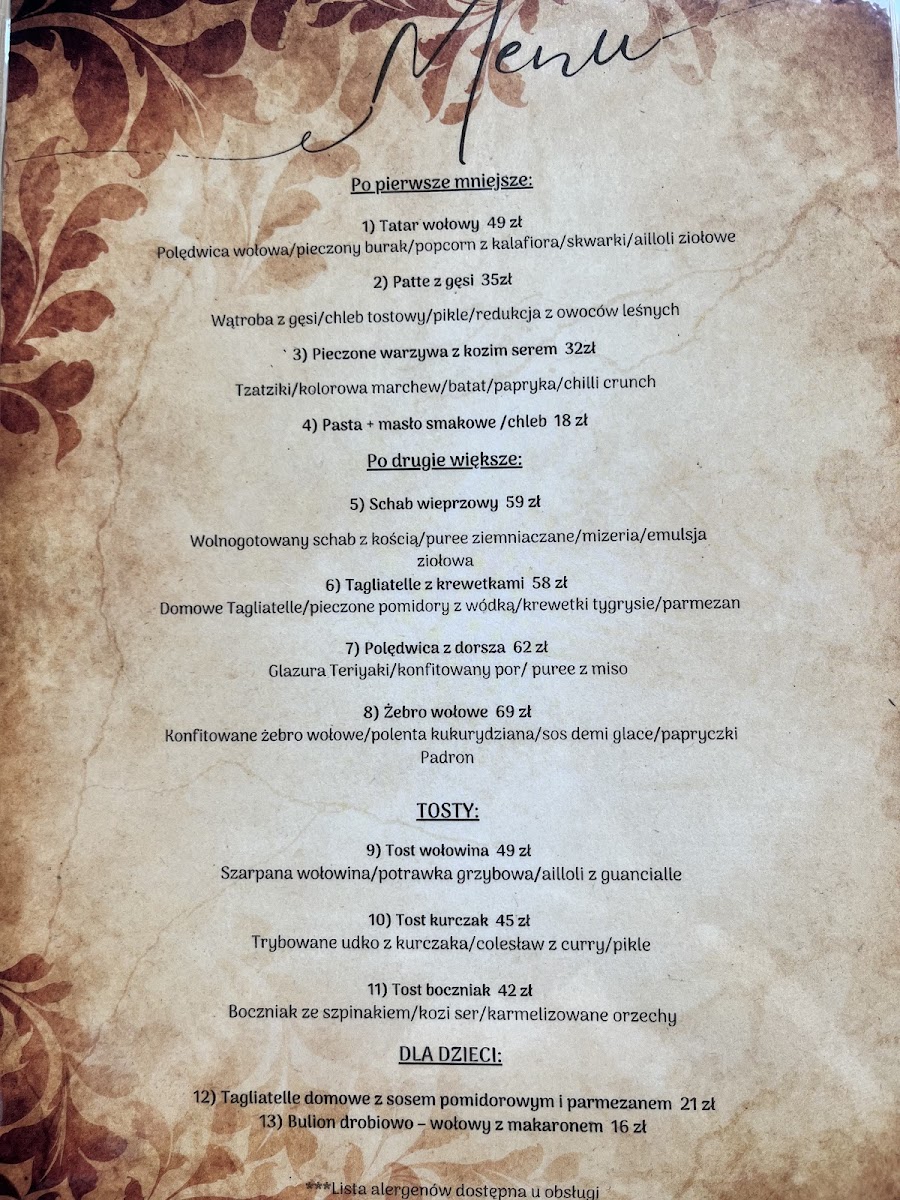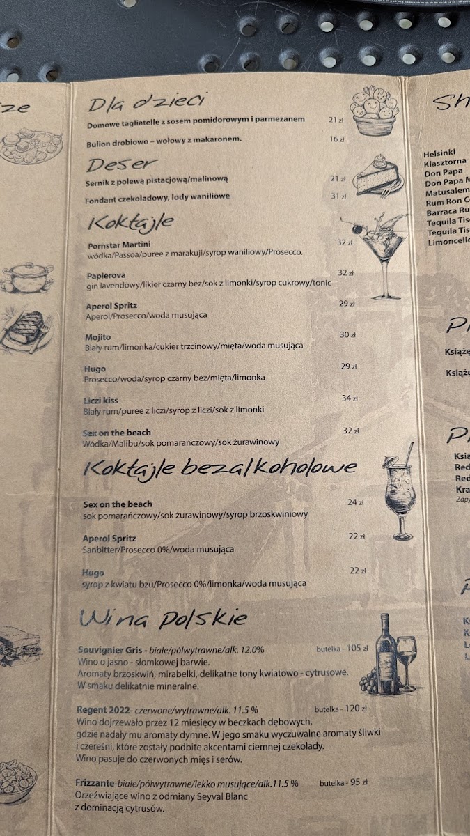 Whether stopping by for a leisurely lunch or enjoying a relaxed dinner, the menu’s variety suits moments of both quiet reflection and casual conversation. Light starters and warming soups like the Zupa Rybna provide a gentle introduction to the meal, while satisfying mains such as Wątróbka Z Gęsi offer depth and richness for more filling dining occasions.